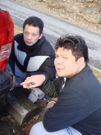 而準備上車下山時..有位不小心的殘障先生...又不小心的親到了育聖愛車的側邊屁股..跟第一次的同一邊..